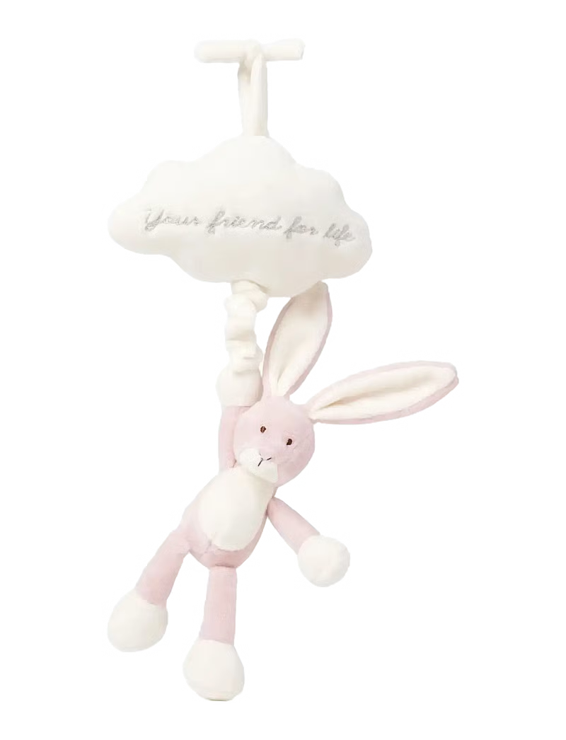 Una suave caja de música con forma de conejito, colgada de una nube blanca bordada con la frase "Tu amigo para toda la vida".