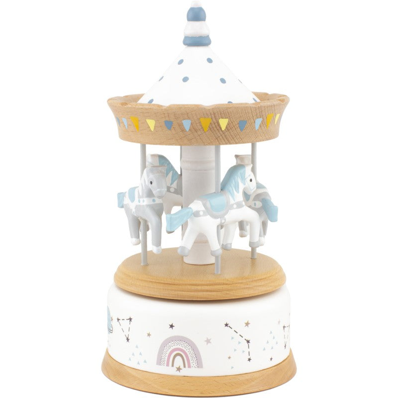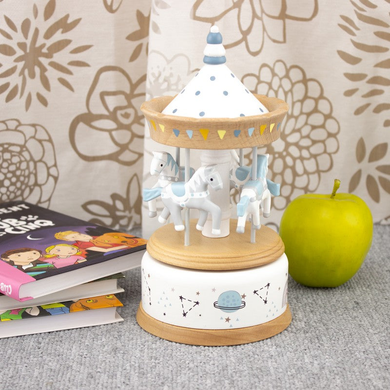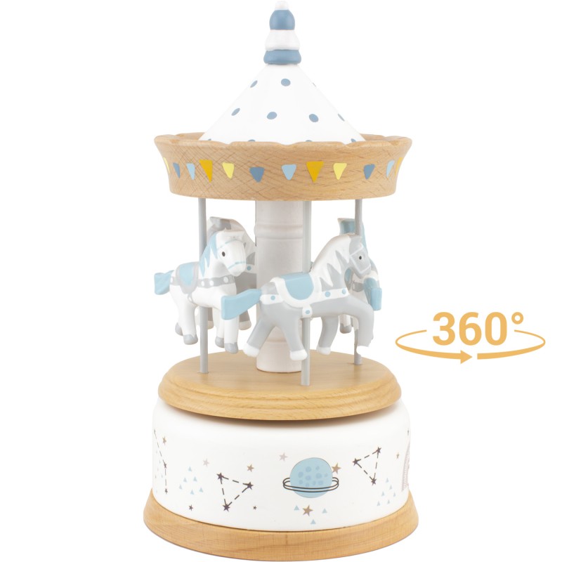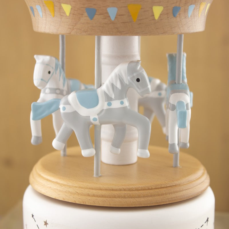 - Descubre nuestro carrusel de madera natural, adornado con pequeños caballos de delicados diseños y suaves colores.