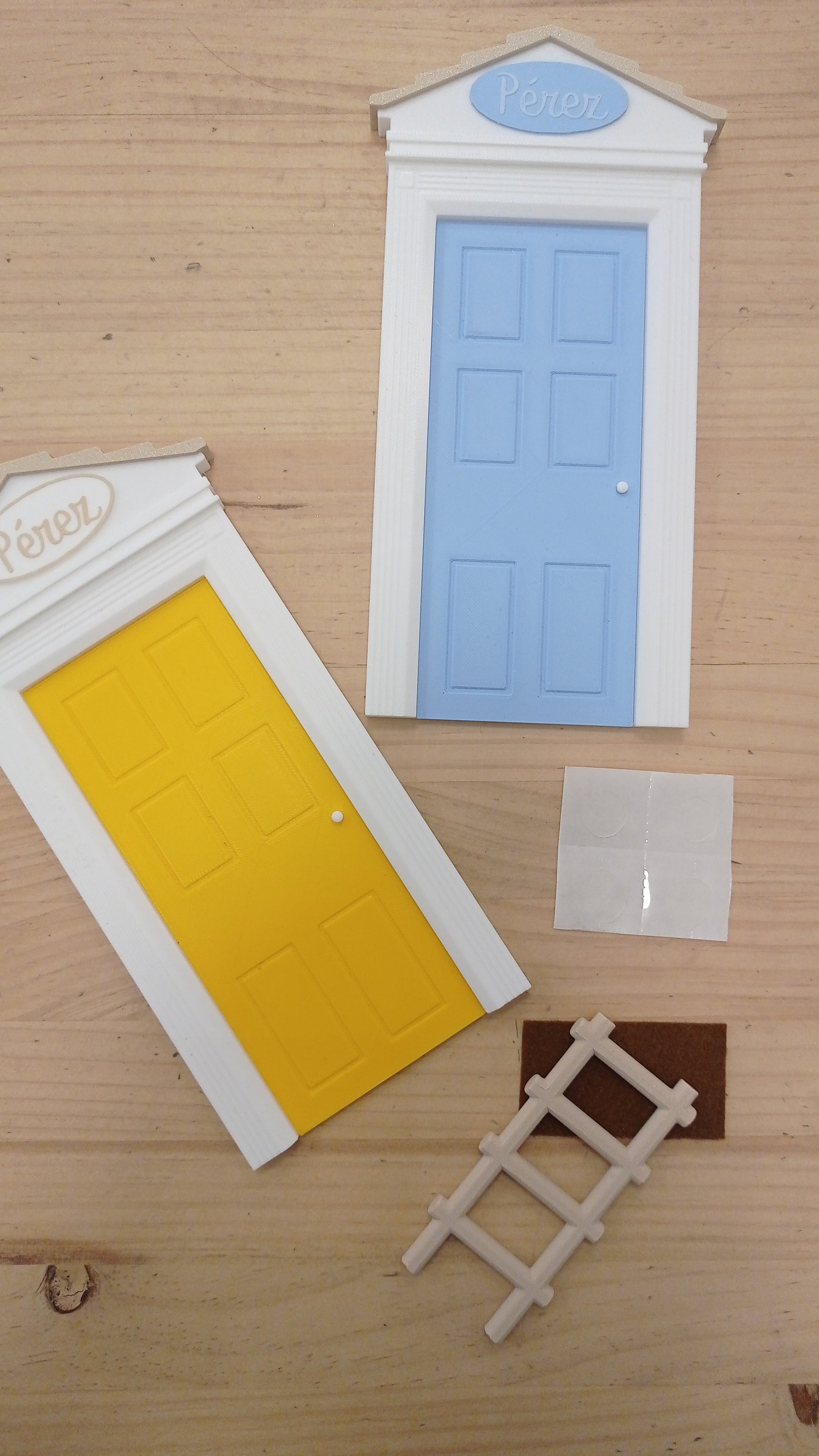 Miden 21 cm de altura e incluyen escalera ,felpudo y 4 puntos de pegamento para adherir a la pared los artículos.